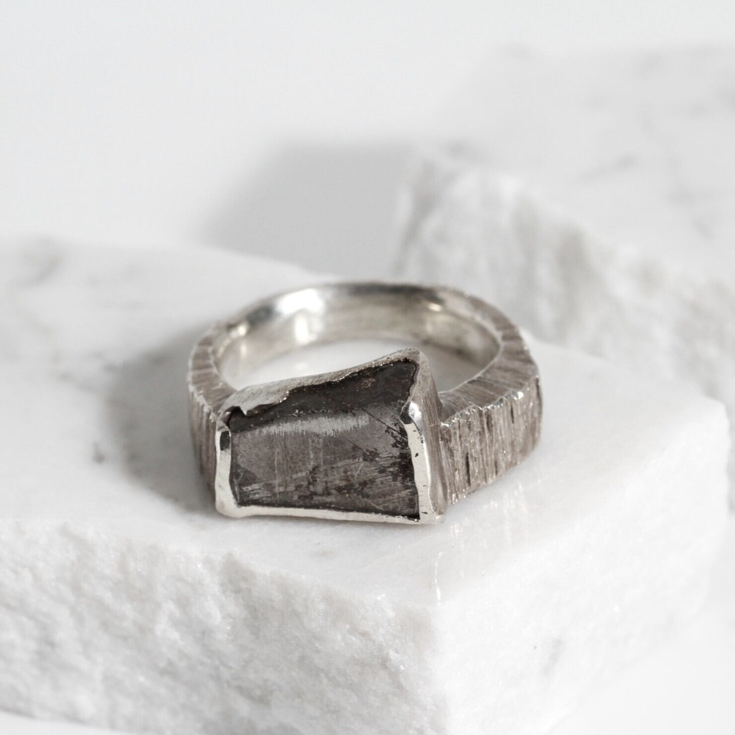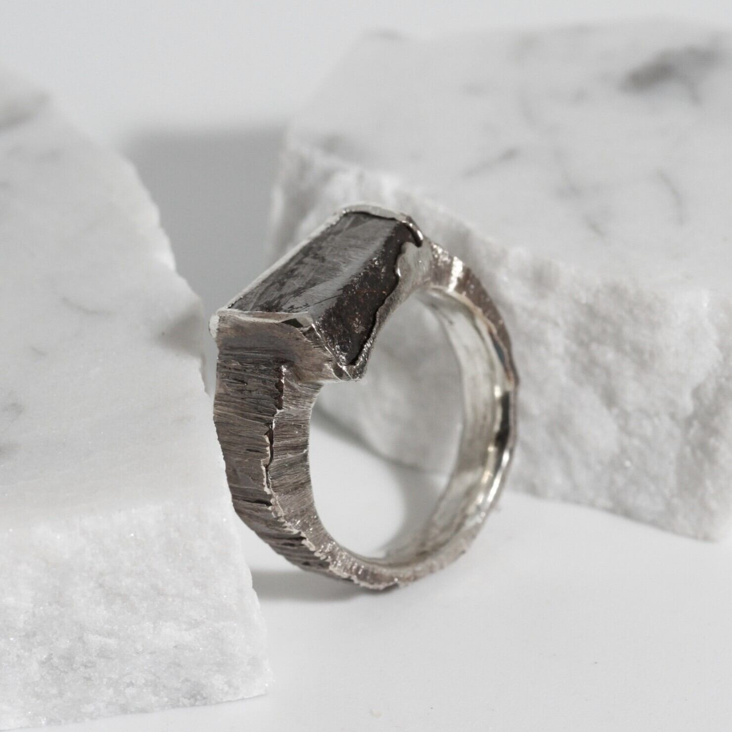 まるで隕石が地球に激突し、指輪に深く埋め込まれたかのような一品。