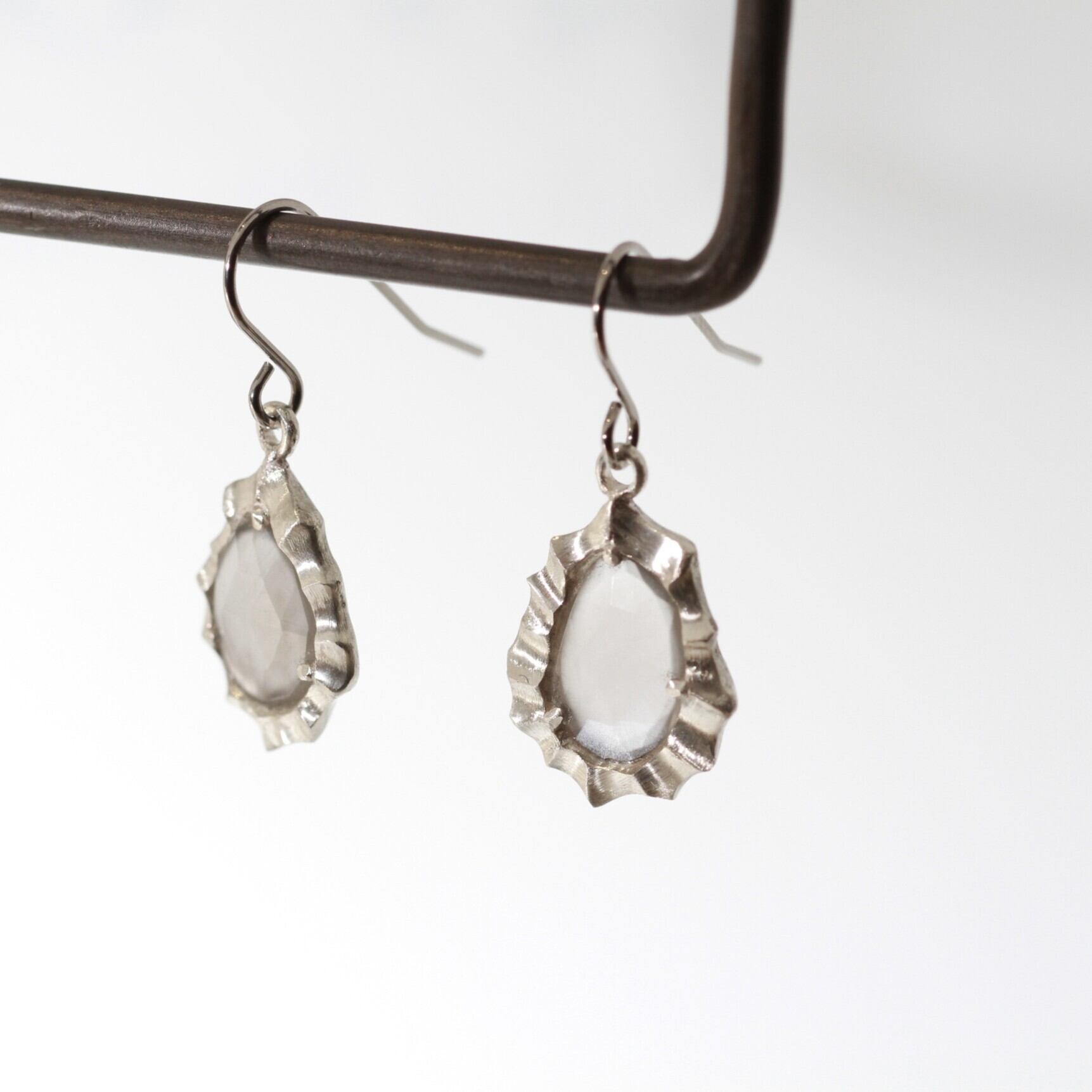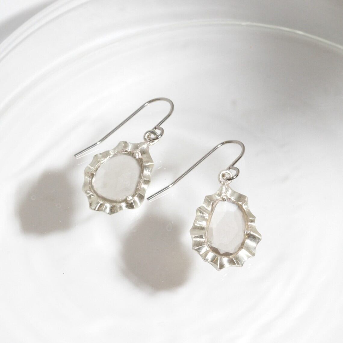 左右非対称のグレームーンストーンをあしらった、海をモチーフにしたピアス。