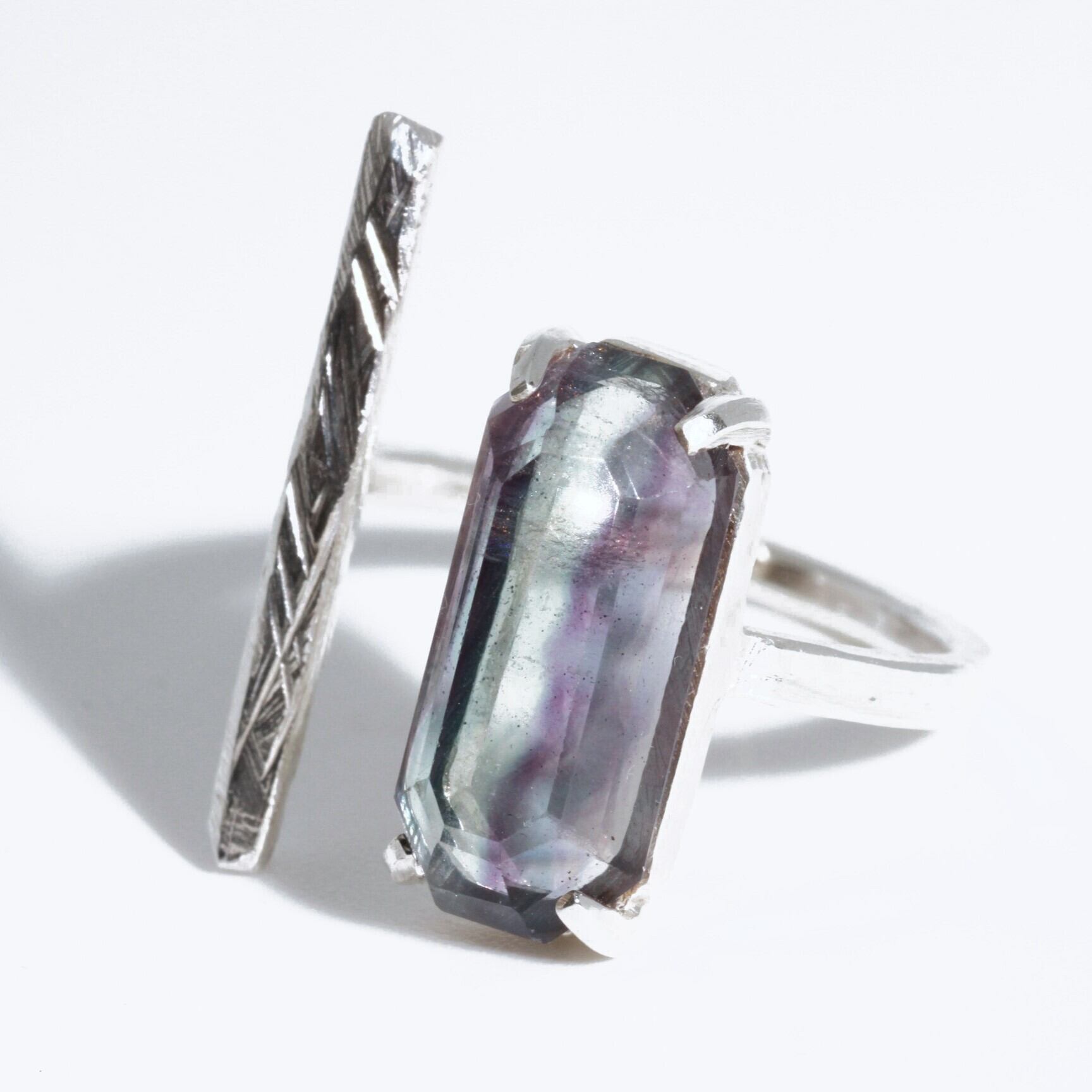大胆な縦長カットを施したフローライトをあしらい、オーロラのように揺らめくブルーとパープルが幻想的な輝きを放つ「Aurora Ring」。
