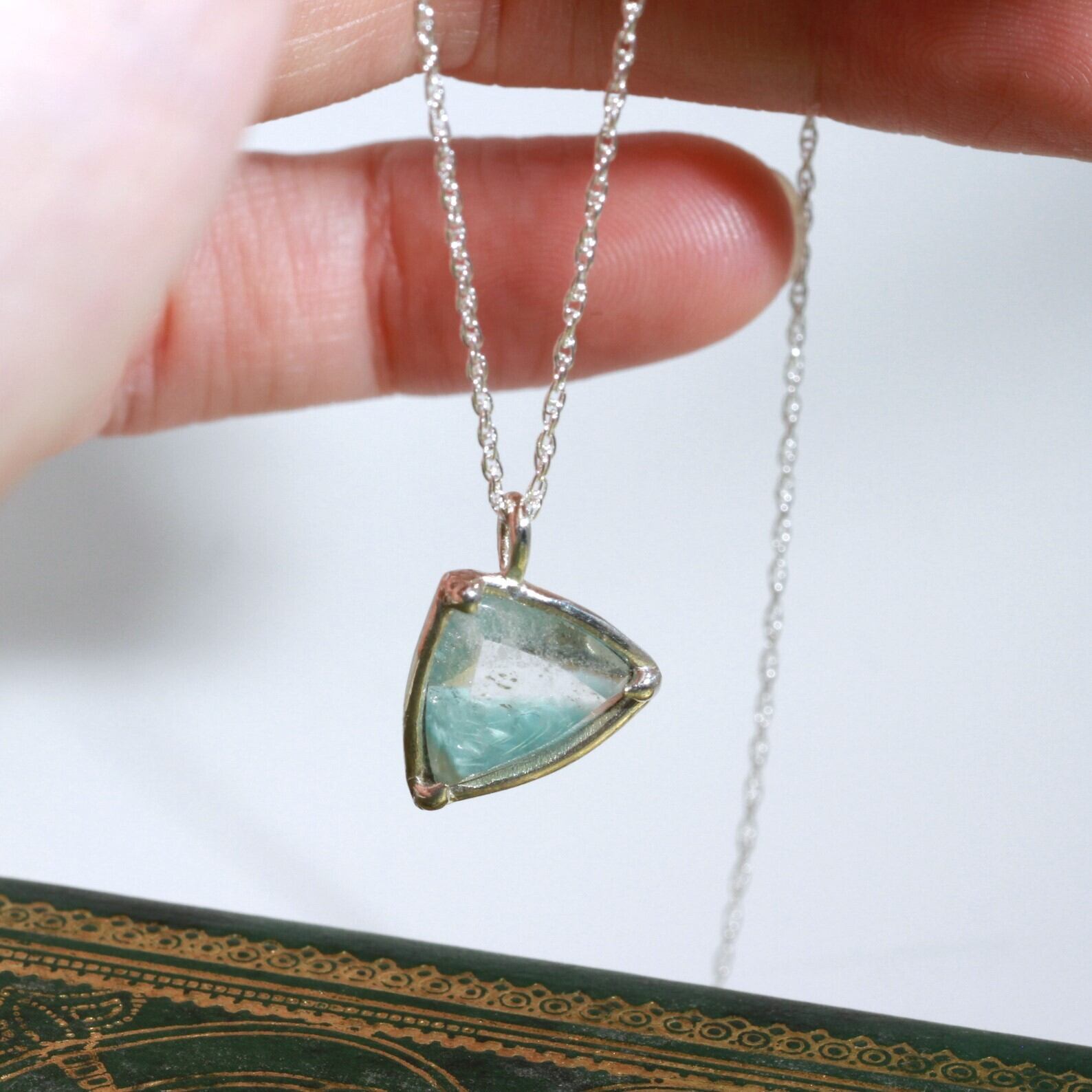 澄んだ水晶の中に、水色のギラライト(ジラライト)がふんわりと漂う、ギラライトインクォーツ。透明感のあるトリリアントカットが施されたこの石は、どの角度から見ても独特の美しさを放ちますが、特に三角形の枠の中で揺れるようにデザインされたことで、まるで青い星の砂が静かに集まる様子が映し出されるようです。