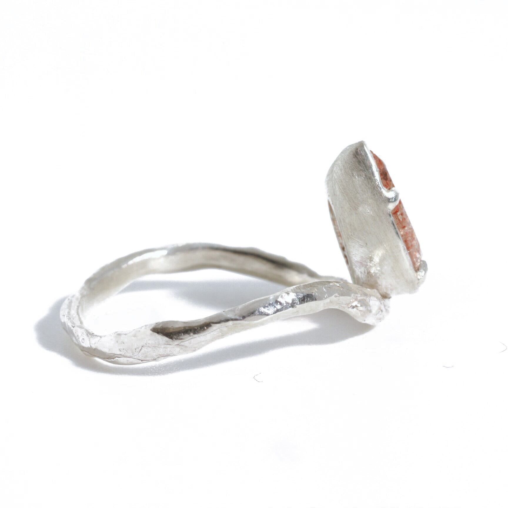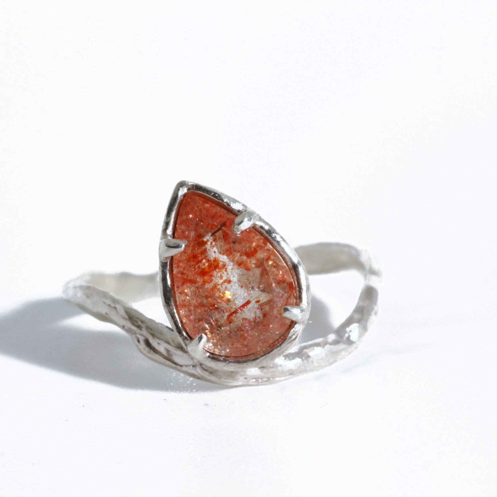 このリングの主役は、情熱的な赤の輝きを放つサンストーン。古来「太陽神の石」として崇められたこの石は、光を受けるたびに内側から虹色の閃光を放つアベンチュレッセンス効果を持ち、まるで熱いエネルギーが指先から迸るかのよう。絶えずきらめく赤色と虹色の内包物が、まばゆい輝きを放ちます。