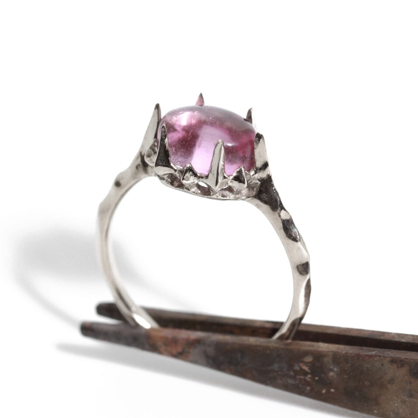 10金ホワイトゴールドのアームにセットされたオーバルカボションのフローライトは、まるで雪の結晶のような6本の爪で支えられ、凛とした清々しさを感じさせます。