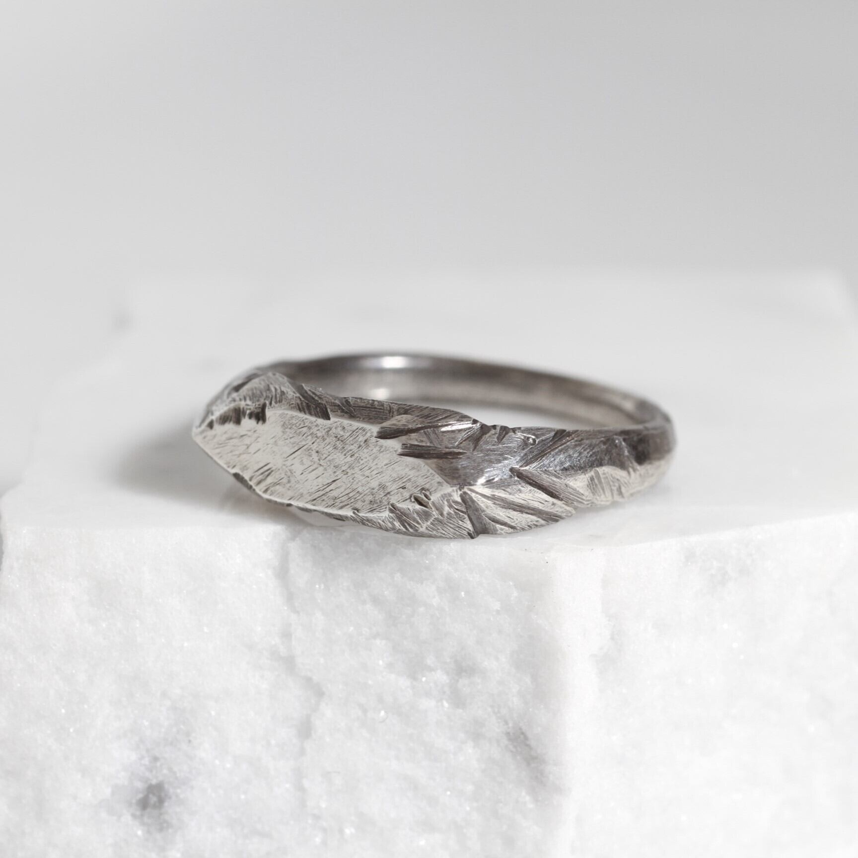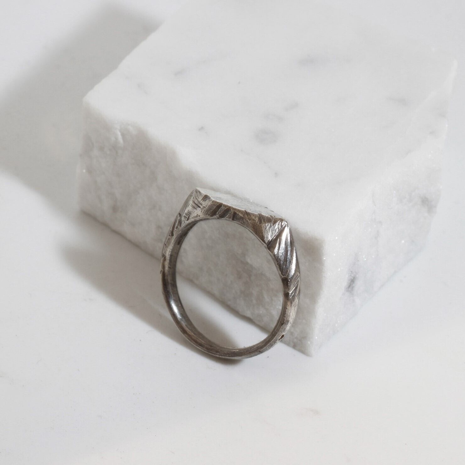 まるで時を重ねてきたかのような風合いのテクスチャと、磨き上げられた鏡面仕上げのトップが織りなすコントラストが印象的です。