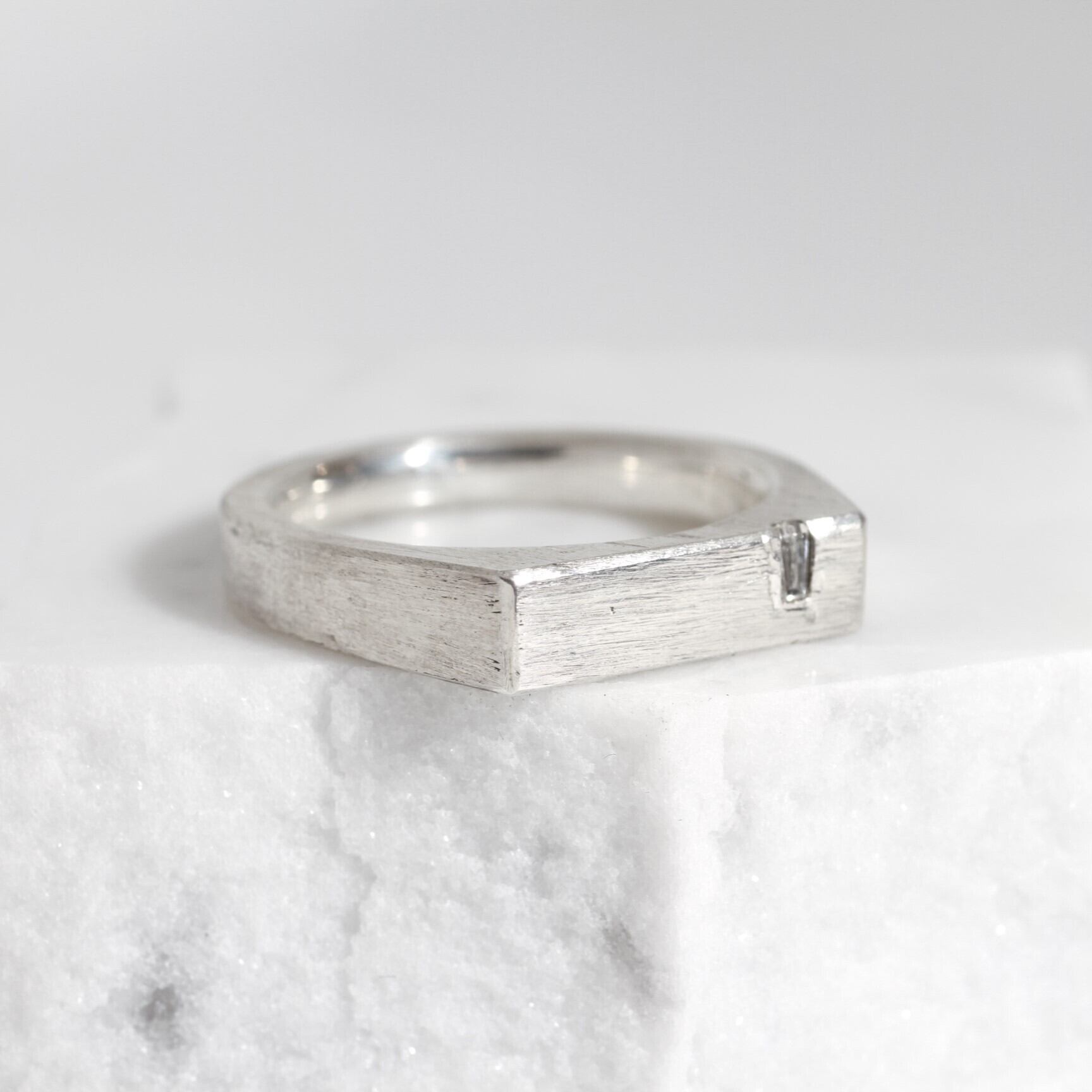 スタイリッシュなテーパーダイヤモンドを埋め込んだ、ファッション性の高いシグネットリング。